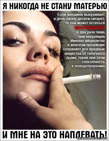 Вы когда-нибудь задумывались, почему сегодня на наших улицах так часто можно встретить курящих женщин? Ведь совсем недавно такая картина была большой редкостью и вызывала всеобщее осуждение. Женщина хочет свободы. Женщина хочет привлечь к себе внимание, ей нужно чем-то занять себя в момент раздумий, но разве все это оправдание? Все можно простить женщине, любую слабость, но только не наплевательское отношение к своему здоровью и здоровью своих детей. Никогда не было свойственно женщине, продолжательнице жизни на Земле, сознательное самоуничтожение. А никак иначе и не назовешь эту глупую и бесполезную привычку – курение табака. Я не буду пугать наших женщин, перечисляя те заболевания, приобрести которые они могут «благодаря» сигарете, не буду говорить о том, что заболевания бронхо-легочной системы женщины практически не излеч