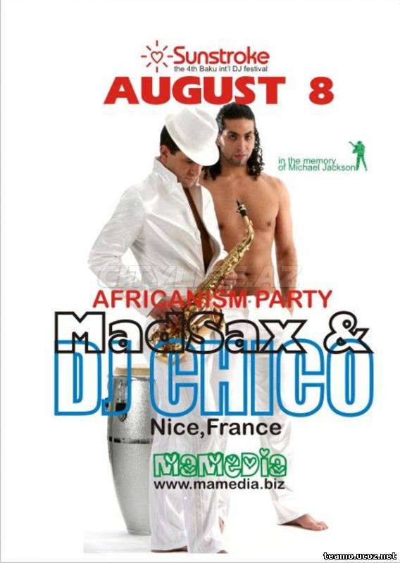 Традиционный africanism party в этом году зажгут DJ Shmell, а также диджей из Ницы DJ Chico ,прославившийся на весь мир своим клубным лайф шоу на перкашн инструментах в стиле deep latino house .DJ Chico завсегдатай всех пати с участием David Guetta,David Vendetta,Bob Sinclar,Martin Solveig и сотен других знаменитостей клубной культуры. Резидент клуба Baouli (Nice,France) .На сцене Sunstroke 4 будет ещё одна клубная знаменитость из Парижа - MadSax, cтавший известным своей виртуозной,поистине сумашедшой лайф игрой на саксофоне в стиле deep house,резидент многих именитых клубов Европы в том числе и Budda Bar ,Barrio Latino.